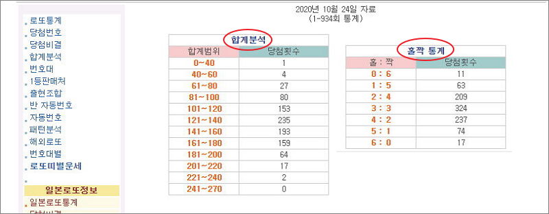 ▼ 이번에는 합계분석과 홀짝 통계입니다. 당첨된 로또 번호의 숫자를 모두 더한 값을 분석한 결과입니다. 보통 로또 번호의 합계가 121에서 140 사이인 경우에 당첨이 많이 됨을 알 수 있습니다. 합계범위 순서에 따라 당첨 횟수가 표기되어 있으니 참고하시길 바랍니다. 홀짝 통계 자료를 살펴보면 홀수와 짝수가 반반이거나 2대 4 또는 4대 2정도일 때가 당첨 확율이 높습니다.