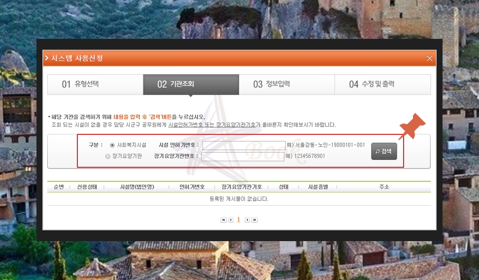 기본적으로 정보시스템에 등록된 곳만 등록할 수 있는데요. 인허가번호와 장기요양기관번호 등을 입력했는데도 검색이 되지 않는다면 담당 시군구 공무원에 연락하여 해당 코드(번호)를 재확인할 필요가 있습니다. 신청을 하셨으면 아래 목록에서 신청상태를 확인할 수 있습니다.