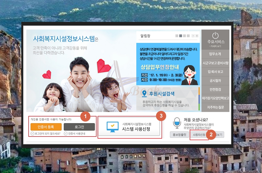 위 이미지는 정보시스템 홈페이지의 첫 화면입니다. 가장 먼저 해야 하는 것은 본인을 인증할 수 있는 공인인증서를 등록해야 하는데요. 그래야 로그인할 수 있답니다. 인터넷 뱅킹을 하시나요? 요즘에는 인터넷으로 은행업무를 많이 하시는데요. 이때 사용하는 공인전자인증서를 그대로 사용할 수 있습니다.
