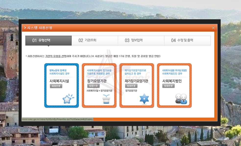 정보시스템을 사용하기 위해서는 ③번 버튼을 누르면 되는데요. 현재 운영하는 기관의 유형을 선택해야 합니다. 사회복지시설, 장기요양기관, 재가장기요양기관, 사회복지법인 이렇게 4가지 유형인데요. 각 유형의 조건이 파란색 글씨로 적혀있으니 참고하세요. 행복e음이나 정부기관에 등록이 되있어야 한답니다.