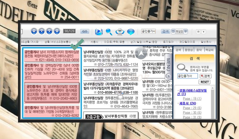 우리가 동네 길거리에서 무료로 얻을 수 있는 종이신문 그대로입니다. 배포대에 가지 않고도 집에서 받아 볼 수 있는 서비스지요. 위를 보시면 페이지 리모콘, 카테고리 이동, 책갈피 기능 등 유용한 기능이 많습니다. 본격적으로 구인구직 노하우를 알려드릴게요.
