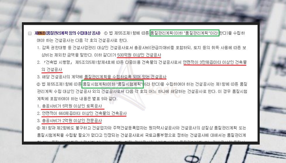규모에 따라 장비, 시험실 규모, 관리자의 배치기준이 달라집니다. 고급공사에서 보시면 품질관리계획을 수립하는 건설공사라는 말이 나오는데요. 이에 대한 조건은 시행령을 보시면 간단하게 알 수 있습니다.