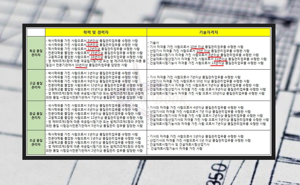 규모가 큰 경우 일수록 비용이 많이 들고, 더욱더 안전에 힘써야 하는데요. 이를 위해서는 적절한 품질관리자의 배치가 필수적입니다. 이는 법으로 규정되어 있는데요. 이에 대해 알아보겠습니다.