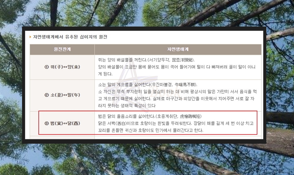 범은 기본적으로 닭의 울음소리과 생긴 모습을 좋아하지 않는다고 합니다. 이런 자연생태계의 근거로 범과 닭은 원진관계를 형성하는데요. 서로 원진인 사람들이 만나면 안 좋거나 포악한 성격이 나타나기 쉽기 때문에 남으로부터 미움을 살 수 있다고 합니다.