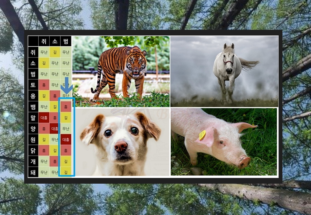위 표는 사주에 근거한 범띠와의 상관관계를 나타내는데요. 말, 개, 돼지는 잘맞는띠로써, 만나게 되면 길하게 될 운명이고, 그와 받대로 원숭이와 뱀, 닭은 좋지 않다고 합니다.