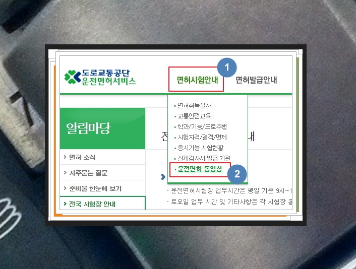 사이트 상단에 메뉴를 보시면 [면허시험안내]가 나오는데요. 클릭해보시면 [운전면허 동영상]이 나옵니다~