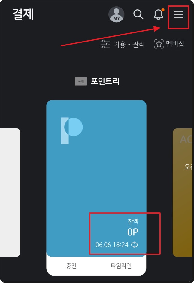 그럼 본격적으로 방금 설치한 kb pay를 이용하여 국민은행 포인트리를 사용해 보도록 하겠습니다. 일단 앱을 실행해 보세요. 그 다음 로그인을 하면 내가 지금까지 쌓은 포인트리가 얼마인지 표시가 됩니다. 제 경우에는 최근에 현금화를 해서 남은 것이 하나도 없네요. 이렇게 확인을 한 후에 우측 상단에 있는 메뉴 버튼을 눌러주세요.