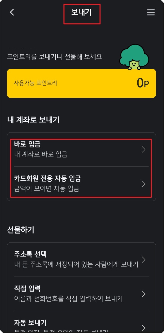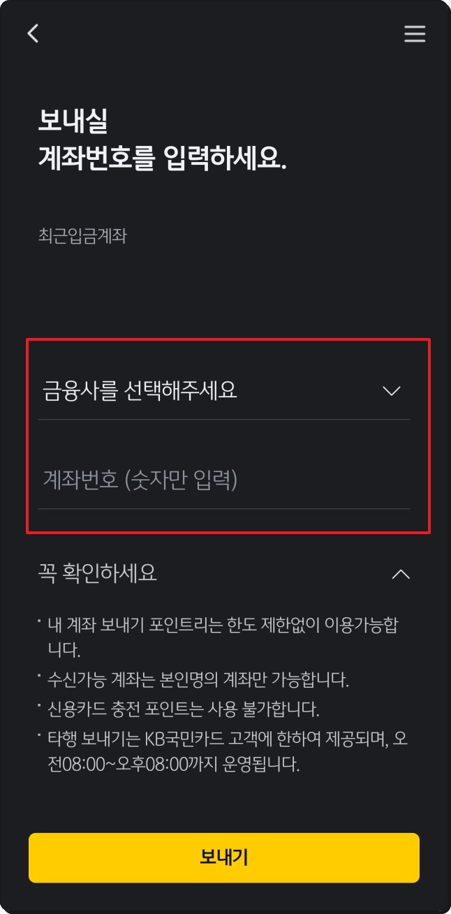 제가 앞에서 언급한 것과 같이 "현금화" 방법이 가장 좋습니다. 국민은행 포인트리 현금화 방법은 간단한데요. [보내기] 메뉴를 선택한 후 [바로 입금]을 선택해 주세요. 그 다음 보내고 싶은 계좌번호를 입력하면 됩니다. 자동으로 입금하는 방법도 있으니 매번 입금하는 것이 번거로운 분들은 활용해 보시길 바랍니다.