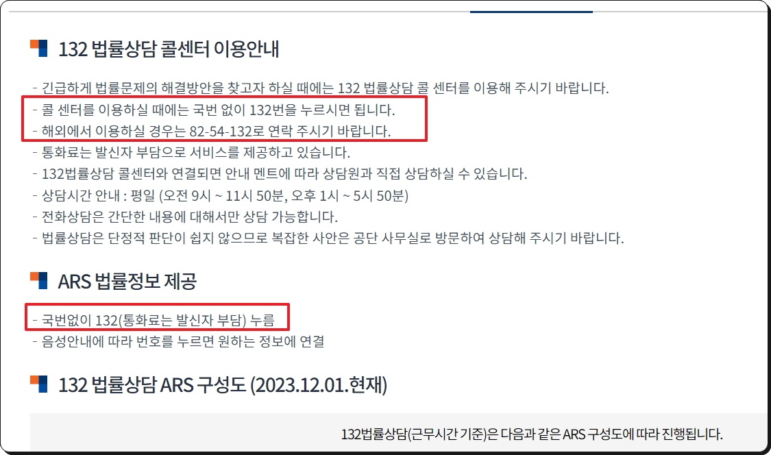 전화를 하는 경우에는 국번 없이 132 콜센터에 연락하면 되는데요. 해외의 경우에는 국가 코드와 지역 코드를 함께 눌러야 합니다. 무료 서비스이지만, 통화료가 발생합니다. 이 점을 꼭 숙지하시길 바랍니다. 서비스 시간은 정해져 있는데요. 복잡한 사안의 경우에는 공단 사무실로 방문해야 한다고 합니다. 대구 지역에 사는 분들은 대구 쪽의 법률상담센터를 방문하면 되겠죠.
