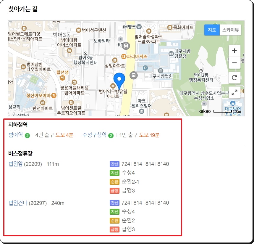 대중교통을 이용하는 분이라면 지하철역과 버스 정류장에 대해 알고 계시면 좋은데요. 2가지 정류장이 마련되어 있습니다. 법원 앞에 111m 거리에 있고 법원 건너편은 240m 거리만큼 떨어져 있다고 하네요.