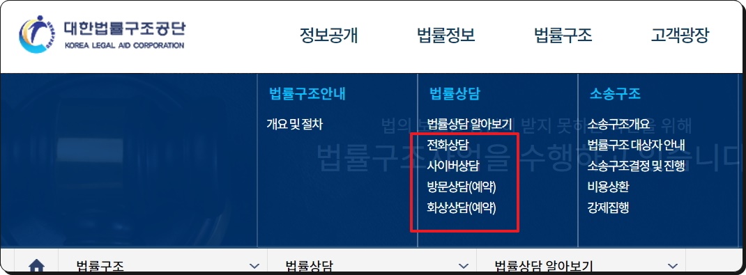 해당 서비스를 무료 진행하기 위해서는 메뉴에 있는 [법률 구조]를 선택하면 되는데요. 전화, 온라인, 방문, 화상 상담으로 구분되어 있습니다. 아래 두 가지는 예약을 진행할 수 있네요.