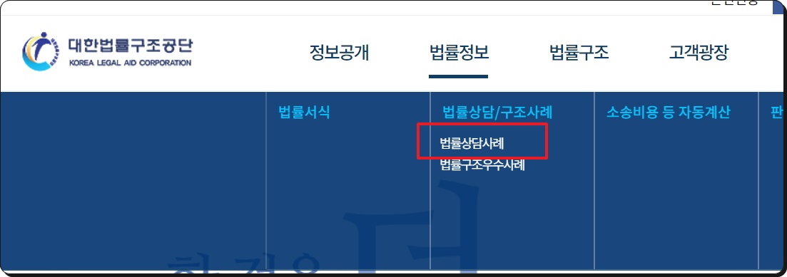 사이트에 접속하면 메뉴에 있는 [정보]에서 [사례]를 클릭해 줍니다. 많은 사람들이 법률상담센터에 문의하여 답변을 받았는데요. 그렇기 때문에 서로 유사한 문제를 겪고 있는 사람들이 있기 마련입니다. 이러한 사례를 확인해 보는 것이 큰 도움이 돼요. 바로 답변 확인이 가능하다는 점에서 즉각 문제 해결에 도움을 받을 수 있죠.