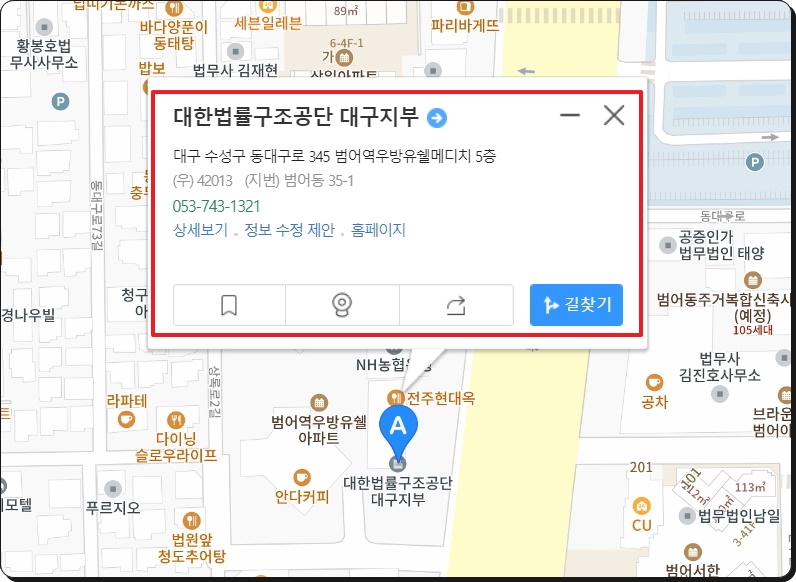 전화를 하는 경우에는 국번 없이 132 콜센터에 연락하면 되는데요. 해외의 경우에는 국가 코드와 지역 코드를 함께 눌러야 합니다. 무료 서비스이지만, 통화료가 발생합니다. 이 점을 꼭 숙지하시길 바랍니다. 서비스 시간은 정해져 있는데요. 복잡한 사안의 경우에는 공단 사무실로 방문해야 한다고 합니다. 대구 지역에 사는 분들은 대구 쪽의 법률상담센터를 방문하면 되겠죠.