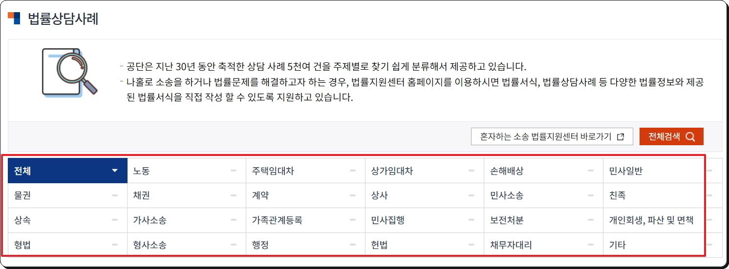 상단에는 여러 가지 카테고리로 구분되어 있는데요. 노동, 주택 임대차, 상가 임대차, 손해배상, 민사 소송, 헌법, 행정, 형법, 상속 등 다양한 분류로 되어 있습니다. 해당 공단에서 30년 동안 축적한 사례를 살펴볼 수 있어요.