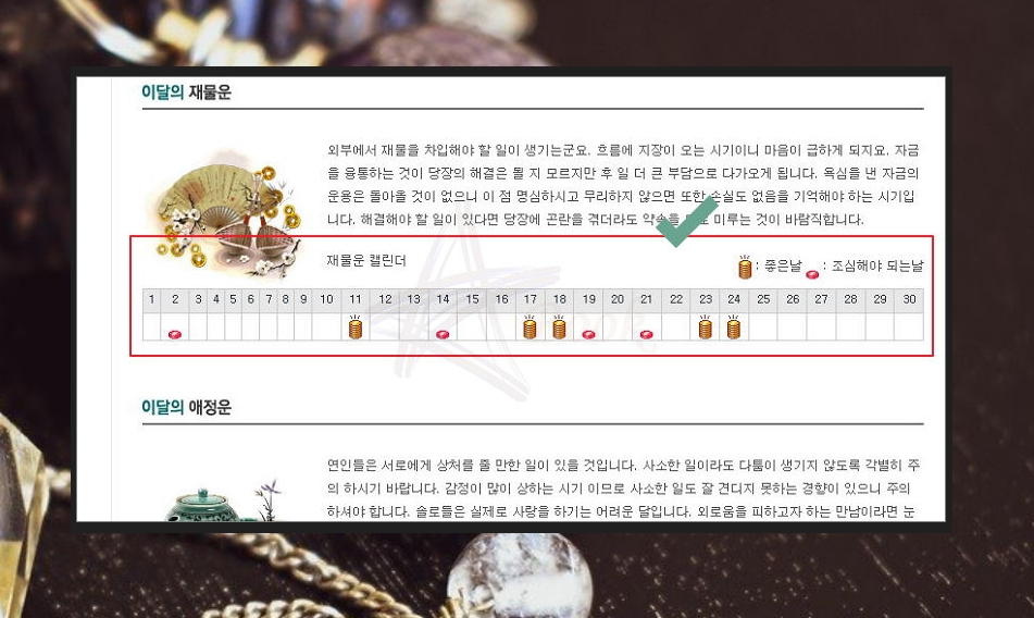 이달의 재물운과 애정운을 살펴볼게요. 이용하는 사람들이 쉽게 알아볼 수 있도록 달력 그림이 있네요. 이런 시각적인 장치를 통해 한눈에 볼 수 있어서 좋네요. 복권을 자주 구매하시는 분이라면 재물운 캘린더를 참고하는 것도 좋을 것 같아요.