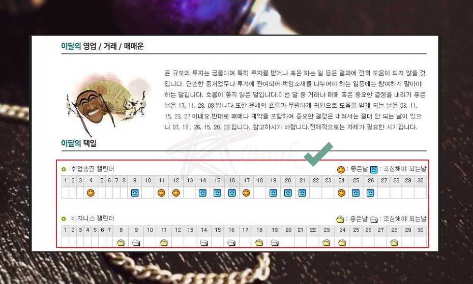 현대 사회에는 많은 사람들이 비즈니스에 종사하시는데요. 이달의 영업, 거래, 매매운을 꼼꼼히 읽어보시면 좋은 성과를 낼 수 있을 거라고 생각이 돼요. 신한생명 사이트가 다른 무료운세 서비스와 다른 것이 더 있는데요. "이달의 택일" 서비스에요. 100% 꼭 맞는다는 보장은 없지만, 가끔 참고하고 싶을 때 유용해요.