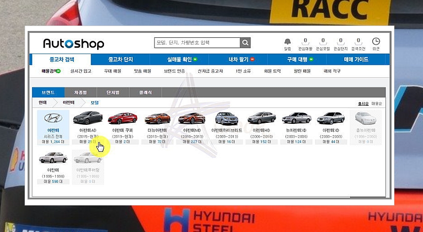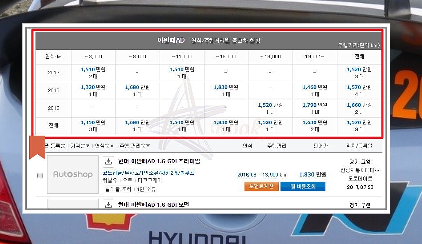 저는 현대 중고차에서 가장 매물이 많은 아반떼를 선택했는데요. 여기서 한 번 더 연식이 가장 최근인 아반떼AD를 선택하면 앞서 보셨던 중고차시세표와 가격을 확인하실 수 있습니다.