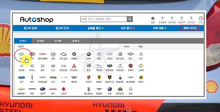 많은 브랜드에 대한 가격정보를 알 수 있는데요. 이번 시간에는 현대 중고차시세표를 알아보도록 하겠습니다. 검색을 누른 후 '현대'를 클릭해주세요.