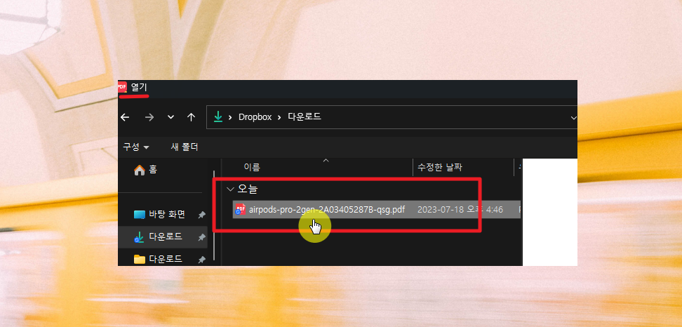 6. 해당 작업을 진행하고자 하는 대상이 되는 문서를 찾아서 선택해 주세요. 저는 에어판 프로의 메뉴얼 문서를 선택했습니다. pdf파일로 되어 있는 문서를 선택해야 해요.