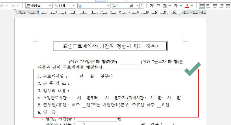 공공기관에서는 사업주와 근로자 사이에 계약을 체결할 때 사용하는 표준근로계약서 양식을 제공하고 있습니다. 기간이 정해진 경우나 정해지지 않은 경우, 외국인이나 연소자용 등 여러 종류가 있습니다. 여러 종류의 계약서 양식이 합쳐진 문서를 공공기관 사이트에서 쉽게 다운 받을 수 있습니다. 물론 제가 파일로 첨부할 것이지만, 최근에 업데이트가 될 수 있으니 가급적 제가 알려드린데로 직접 받는 것을 추천합니다.