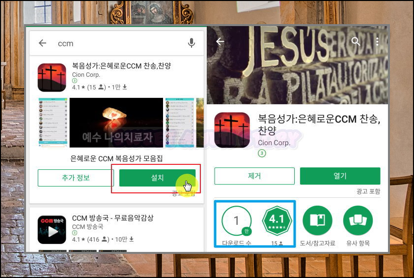 검색을 하시면 복음성가(은해로운CCM 찬송, 찬양) 어플을 찾으실 수 있는데요. 설치 버튼을 누르면 자동으로 설치가 됩니다. 해당 어플은 CCM 무료듣기의 기능은 물론이고, 다양한 최신곡을 감상하게 해주는데요. 사용자수는 1만명, 평점은 4.1점으로 만족도가 꽤 높습니다.