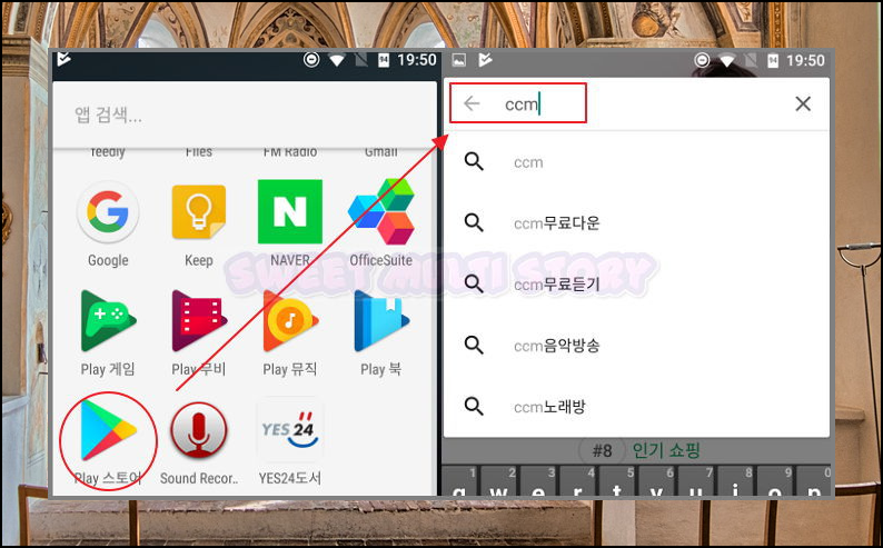 주로 많은 분이 컴퓨터로 음악 감상 사이트를 이용하시는데요. 그럼 집에서만 CCM을 감상할 수 있습니다. 이동 중에도 가스펠송이나 성가곡, 찬송가 등을 듣고 싶다면 스마트폰이 편리한데요. 무료듣기가 가능한 어플을 알려드리겠습니다. Play 스토어를 실행한 후 "CCM"이라고 검색을 해주세요.