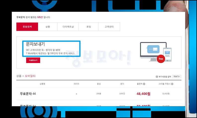 3) 검색 결과가 121건이나 나오는데요. 가장 처음에 나온 결과를 살펴보면 문자보내기 서비스를 찾으실 수 있습니다. SKT 고객이라면 이용할 수 있는 혜택이고, 매월마다 100건의 무료문자 보내기 서비스를 이용할 수 있다고 합니다.