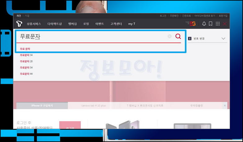 2) 티월드에 접속하면 홈페이지 오른쪽 위에 돋보기 모양을 찾으실 수 있습니다. SKT 사이트 내부에서 검색을 하는 기능을 가진 버튼인데요. 해당 버튼을 누른 후 '무료문자'를 입력 후 엔터를 눌러주세요.
