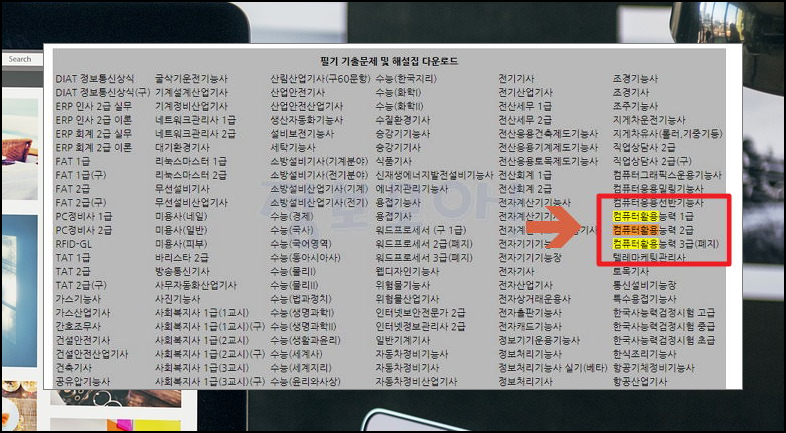2) 사이트에 접속하면 다양한 자격증의 이름이 나타납니다. 컨트롤+F를 누른 후 '컴퓨터활용'을 검색하면 컴활2급 필기 기출문제를 쉽게 찾을 수 있습니다. 3급의 경우에는 폐지가 되었고, 컴활1급은 어려운 편이니 2급을 취득한 후 천천히 준비하는 것이 좋습니다.