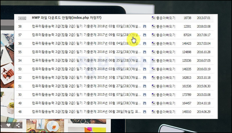 3) 게시물을 보시면 올해 시행된 2018년 3월 3일자 필기 기출문제까지 업로드가 되어 있음을 알 수 있는데요. 컴활2급 필기는 문제은행식으로 출제가 되기 때문에 꼭 최신 기출문제만 풀 필요는 없습니다. 전체적으로 두루두루 풀어보세요.