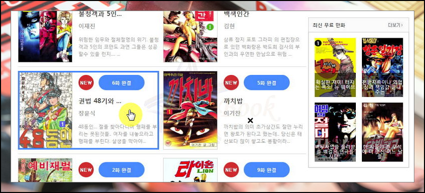 몇몇 작가의 완결 작품을 무료로 볼 수 있도록 되어 있는데요. 보름에 한 번씩 새로운 만화가 업데이트 되기 때문에 주기적으로 찾아보기 좋은 곳이에요.