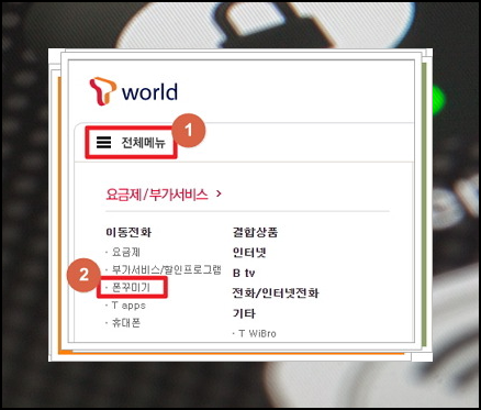 sk 사이트인 티월드에서 메인 화면에 있는 여러가지 추천 상품들이 눈길을 끌고 있는데요. 정신 차리시고 좌측 상단에 [전체메뉴]를 눌러주세요. [폰꾸미기] 보이시죠? 클릭해주세요.