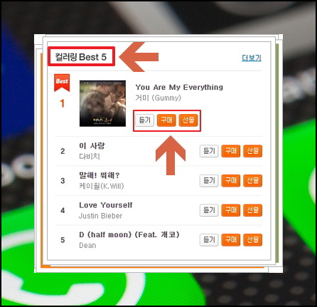 좌측 하단에 보시면 [컬러링 Best 5]가 나오는데요. 여기서 바로 sk 컬러링 바꾸기 하실 수 있습니다. [듣기]를 눌러 하이라이트, 전반부, 후반부를 들어보실 수 있고요. 구매뿐만 아니라 친구에게 선물 보내기도 가능하답니다.