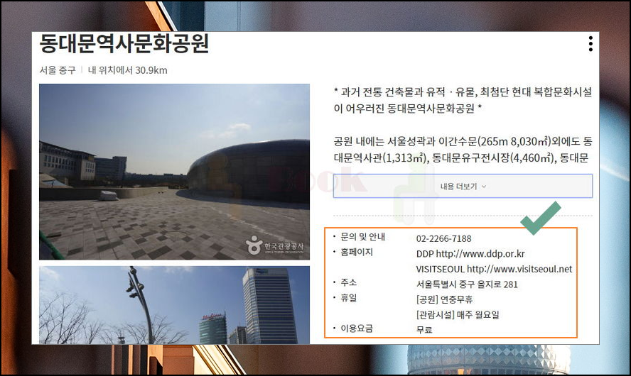 볼거리와 먹거리가 많은 동대문역사문화공원은 당일여행을 하기에 적합한 곳인데요. 해당 공원의 주소는 물론이고, 이용요금, 휴일, 홈페이지 등 많은 정보를 살펴볼 수 있어요. 사진을 통해 미리 한 번 살펴보는 것도 좋아요.