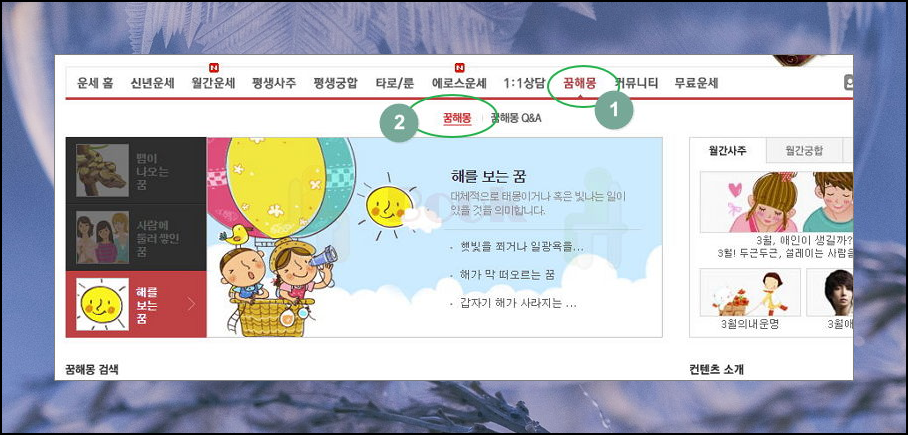 네이트 운세 홈페이지에 접속하게 되면 다양한 운세 서비스를 만나볼 수 있어요. 메뉴의 우측 3번째에 있는 꿈해몽을 클릭해 주세요. 최근에 해를 보는 꿈을 꾼 적이 있으신가요? 태몽이거나 잘 되는 일이 있을 것을 의미한다고 하네요.