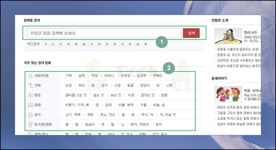 사이트에서는 무료 꿈해몽 풀이를 마음껏 살펴볼 수 있어요. 검색이나 카테고리 선택을 통해 찾아볼 수 있는데요. 보시는 바와 같이 우리 삶에서 겪거나 만나볼 수 있는 모든 것들에 관한 것을 담고 있어요. 100가지 이상은 충분히 넘는데요. 일반적으로 가족이나 애인이 많이 나오는 것이 많다고 하네요.
