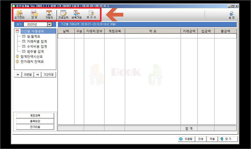 ▼ 프로그램 실행 화면입니다. 화면 상단을 보면 회기관리, 장부, 거래처, 전표입력, 반복거래, 보고서 메뉴가 보입니다. 유저 인터페이스가 직관적으로 되어 있기 때문에 회계 초보자도 쉽게 사용할 수 있습니다.