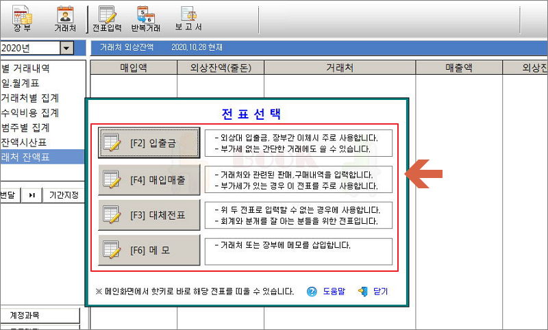 ▼ 가장 많이 사용하게 될 전표 입력 기능입니다. 입출금, 매입매출, 대체전표, 메모 이렇게 4가지로 구분하여 내용 입력이 가능합니다. 각 기능창에는 "도움말" 버튼이 있습니다. 프로그램을 사용하다가 어려운 점이 있을 때 해당 버튼을 누르면 됩니다.