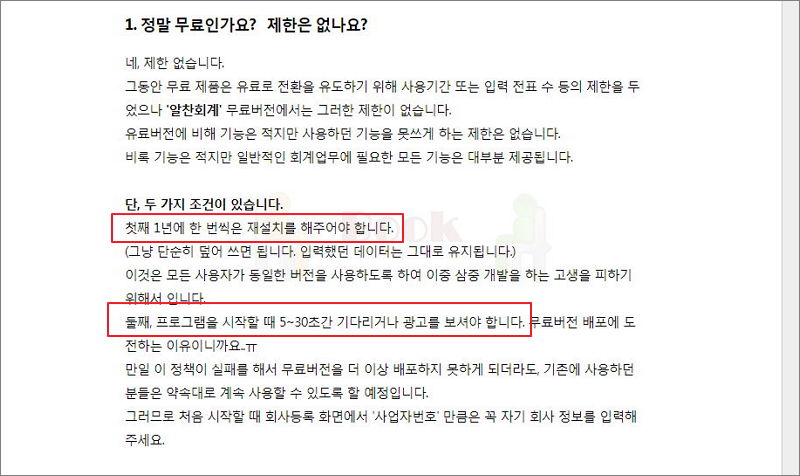 ▼ 입력 전표 수나 사용 기간 등의 제한도 없음을 알 수 있습니다. 다만, 1년에 한 번 재설치를 해야 하고, 프로그램을 시작할 때 광고가 나옵니다. 회계 프로그램을 무료로 사용하는 만큼 이 정도 수고는 괜찮다고 생각합니다.