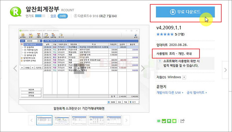 ▼ 네이버 소프트웨어 자료실로 이동하게 됩니다. 이곳에서 "무료 다운로드" 버튼을 클릭하면 알찬회계장부 프로그램에 대한 설치 파일을 다운 받을 수 있습니다. 사용범위를 보면 무료를 의미하는 "프리" 표시가 명확히 표시되어 있습니다.