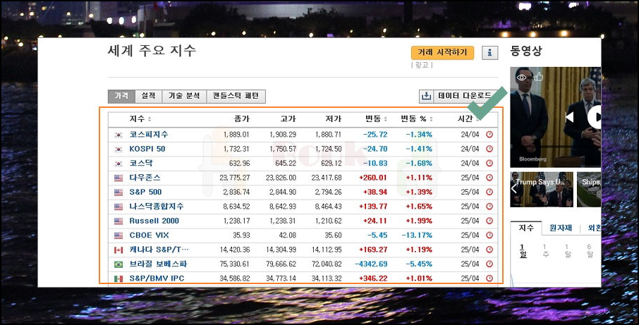 세계 각국을 대표하는 지표를 확인할 수 있는 페이지가 열렸어요. 국내 주식시장이 열린 경우에는 코스피와 코스닥에 대한 것도 실시간으로 확인할 수 있고요. 다른 나라의 경우 그 나라의 시장이 열려야 실시간으로 움직이는 지표를 확인할 수 있어요. 장이 끝난 상태라면 종가를 확인하면 돼요.