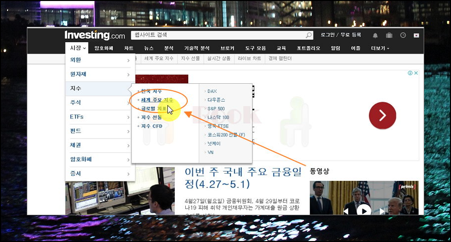 인베스팅 홈페이지에 접속했어요. 사이트를 둘러보면 아시겠지만, 투자를 할 때 참고하면 좋은 정보들이 많아요. 대부분 실시간으로 제공되는 정보이기 때문에 빠르게 정보를 얻기에 좋은 곳이에요.