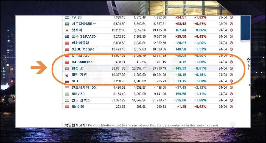 리스트에서 홍콩항생지수는 아래쪽에 위치해 있어요. 변동 금액과 변동률을 살펴보니 최근에 하락을 했었네요. 좀 더 자세히 그리고 많은 정보를 얻고 싶다면 [항생]을 마우스로 클릭해 보세요.