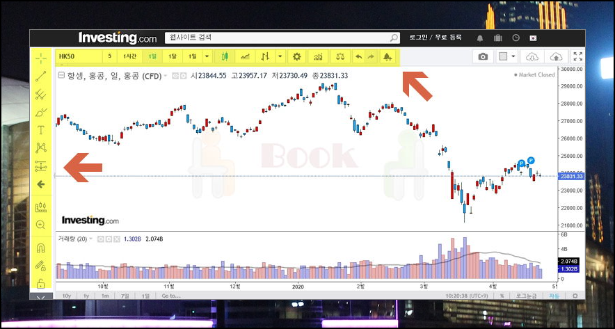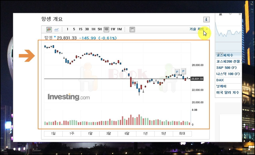 차트 우측 상단을 보면 [기술 차트] 버튼이 있는데요. 해당 버튼을 클릭해 보세요. 그럼 이렇게 고급 기능을 갖춘 차트를 이용할 수 있어요. 홍콩이나 항생지수에 관련된 뉴스가 뜨면 이렇게 실시간으로 차트에 반영이 되기도 해요.