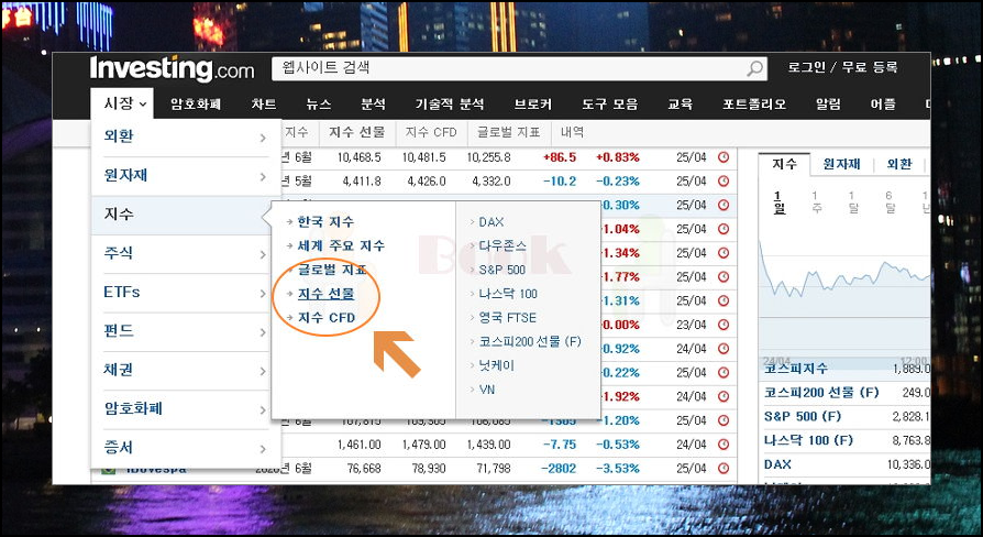 인베스팅에서는 실시간 선물지수도 조회가 가능한데요. [시장]과 [지수 선물]을 차례대로 클릭하면 돼요.