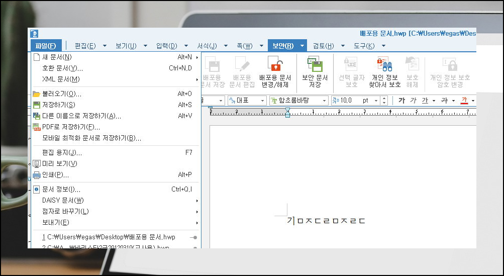 배포용 편집 상태로 되돌렸습니다. 다시 한글에서 파일 메뉴를 열어보면 저장하기에서부터 인쇄까지 클릭할 수 있게 버튼 활성화 된 모습을 보실 수 있습니다.