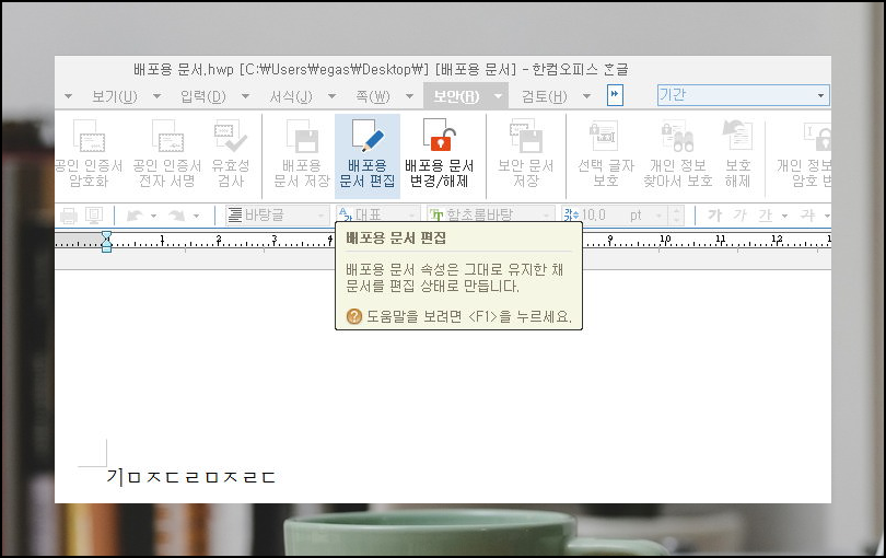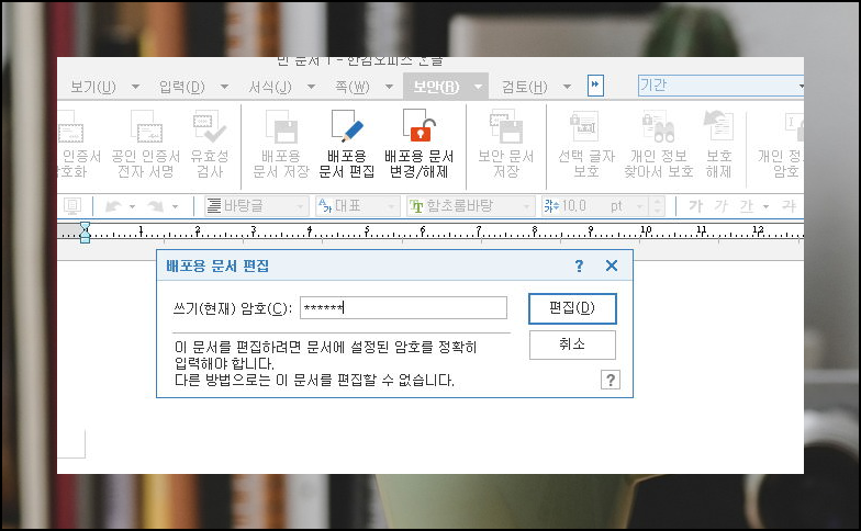 보안 탭에 있는 배포용 문서 편집 버튼을 누릅니다. 문서의 속성은 그대로 유지한 채 한글 문서를 편집 상태로 만들 수 있습니다.
