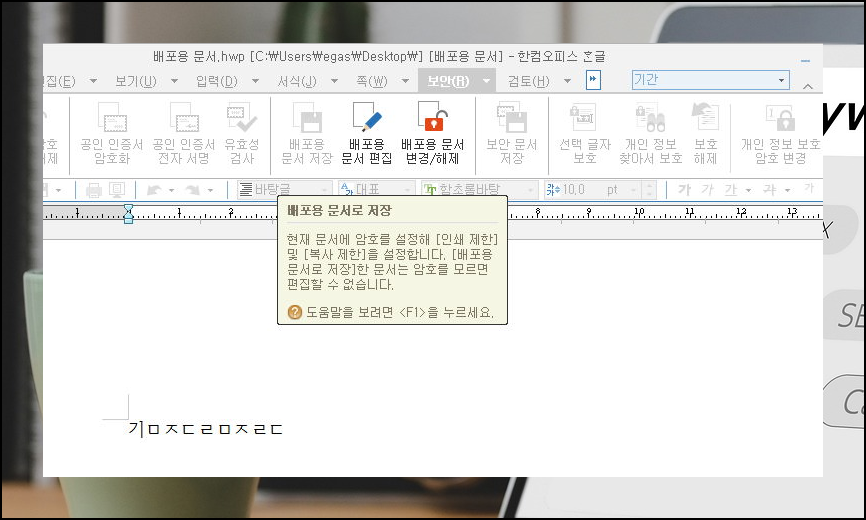 보안 탭에 있는 배포용 문서 편집 버튼을 누릅니다. 문서의 속성은 그대로 유지한 채 한글 문서를 편집 상태로 만들 수 있습니다.