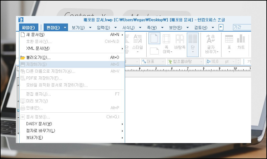 배포용 편집 상태로 되돌렸습니다. 다시 한글에서 파일 메뉴를 열어보면 저장하기에서부터 인쇄까지 클릭할 수 있게 버튼 활성화 된 모습을 보실 수 있습니다.