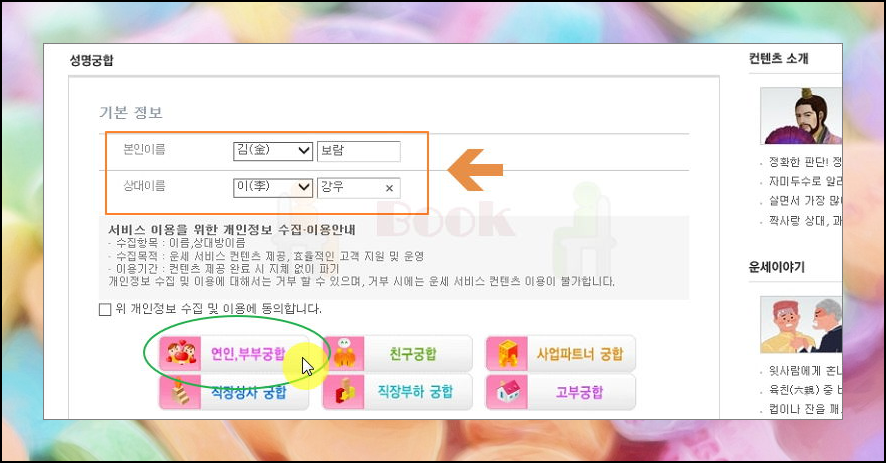 3. 성명 궁합으로 오늘의 기운을 알아볼 수 있어요. 가장 보기 쉬운 성명 궁합을 통해 오늘의 애정운세에 관련된 기운을 살펴볼게요. 성명 궁합을 이용하려면 2가지 정보를 입력해야 해요. 본인과 상대방의 이름인데요. 이 때 상대방의 성을 한자로 입력해야 해요. 정확하게 입력해야 제대로 된 결과를 만나볼 수 있어요. 성명 궁합을 통해 연인과 부부 사이의 애정운세는 물론이고, 친구, 사업파트너, 직장 동료, 고부 간에도 어떤 기운이 흐르는지 알 수 있어요.